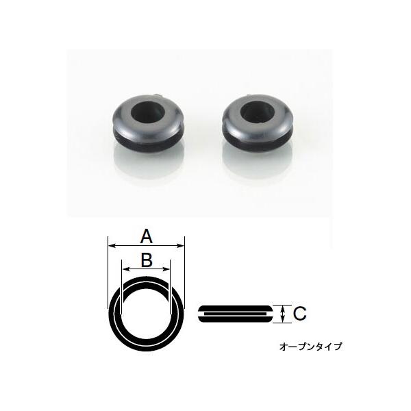 品番:オープン(0900-755-09102) クローズド(0900-755-09112) ■オープンタイプはパネルやシャーシ等を貫通する電線を保護することが出来ます。クローズドタイプは開けてしまった穴を簡易的に塞ぐことを目的としています(※オイル漏れ等を防ぐ為の物ではありません、ご注意下さい)。 ○材質:PVC(耐熱温度:-20℃〜80℃) ○A:Φ13.3 B:Φ6.4 C:6.3(厚み) ○適合下穴:Φ10 適合板厚:1.5〜2mm ○2ヶ入り ブラック ※取り付け穴加工の際は下穴のサイズ、板厚をよく確認した上で加工して下さい。