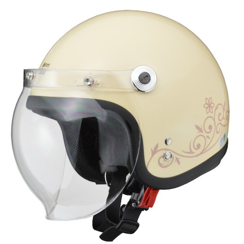 特長:女性に人気のスモールロージェットに開閉式バブルシールドを装備したモデル。 バブルシールドはデザイン性に優れているだけでなく眼鏡やサングラスとの干渉を避け、巻き込み風を最小限に抑えます。 カラーバリエーション豊富なオプションシールドと組み合わせれば自分好みにカスタマイズもできます。 開閉式シールド シールド素材は強靭なポリカーボネイトを採用。 ハードコート・UVカット仕様。 ラチェット式のフリップアップ機構は片手でスムーズな開閉が可能。 着脱式内装 サイズは頭周り55〜57cm未満のレディースフリーサイズ。 通気性の良いメッシュ材を使用し、帽体内にこもりやすい熱やムレを軽減。 着脱式インナーを採用し、洗浄が可能でクリーンに保てます。 ラチェット式バックル 着脱、調整の容易さはもちろんラチェットを締めた際の圧力に偏りが少なく優れたフィット感を実現。 ヘルメットホルダー固定用のDリングを装備。
