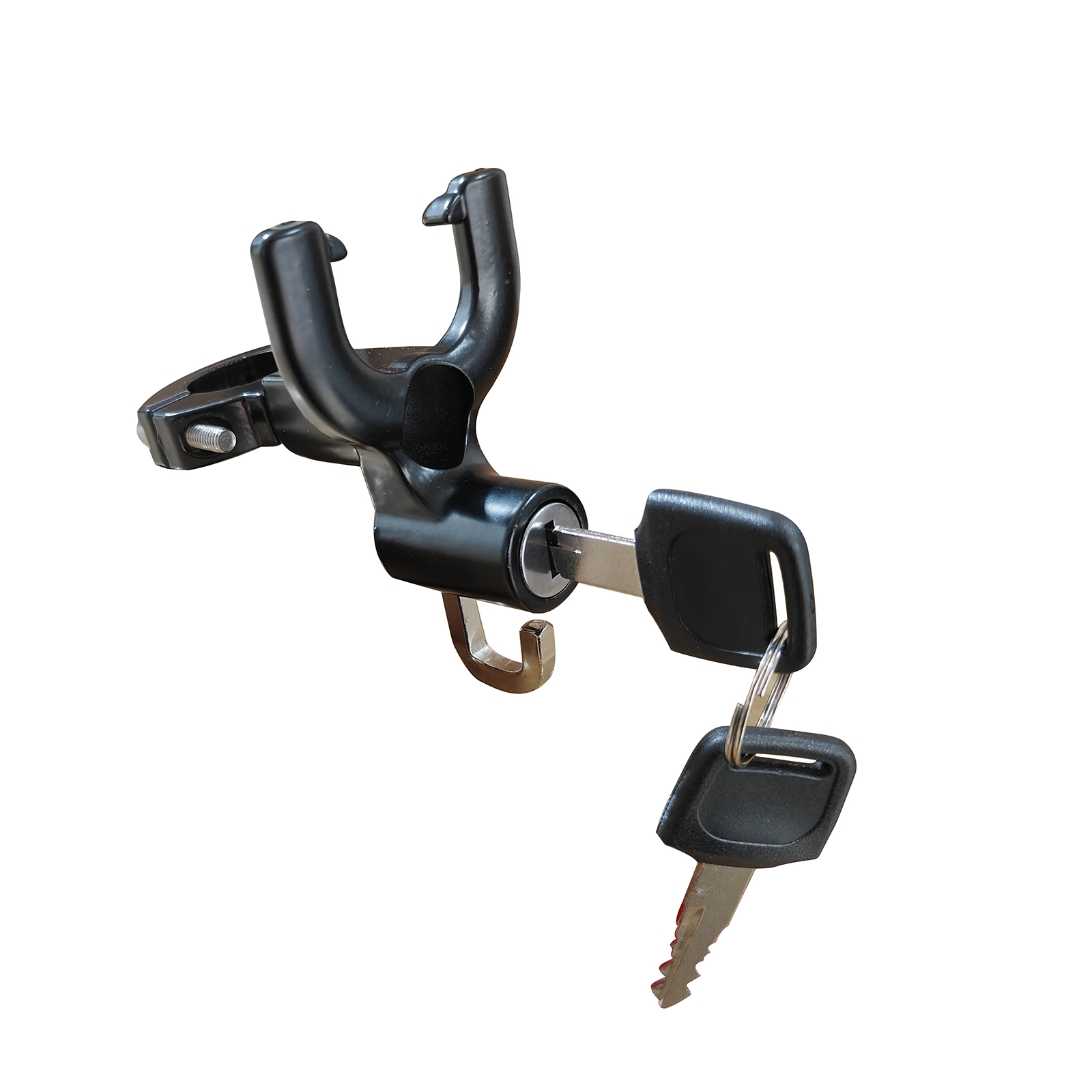 特長:ハンドルバーに取り付けるタイプのヘルメットロックです。 バイク中の特にスポーツタイプのバイクで顕著なのがヘルメットホルダーがない、もしくは使いにくいということがありがちです。本製品を使用してからその問題を解決することができます。 上部のフックを利用すればバッグや買い物袋、ペットボトルなど掛けることができます。