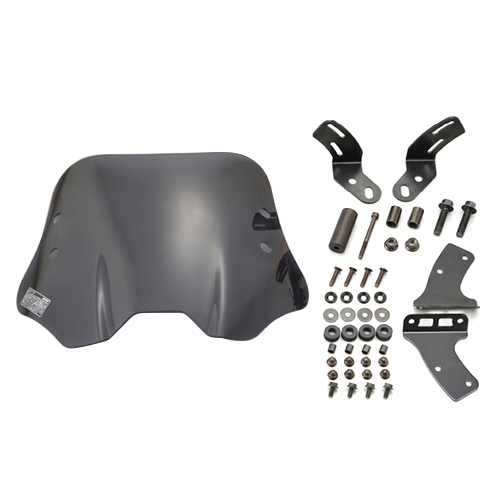 特長:スポーティーなエアロ形状フォルムのウインドシールドセット。スタイリッシュなデザインを演出するショートスモークタイプ。 正面から来た空気を上部へ送り、体への抵抗を軽減します。 ウインドシールドは、状況に合わせ約10度の範囲内で角度調整が可能です。 ウインドシールドの素材は、同厚のアクリルに対し約30倍の強度を持つポリカーボネート(厚さ3mm)を採用。また、耐傷性,耐UV性を向上させるためにハードコーティングを施し、高い透明度と耐久性を両立しました。 付属のクランプバーは、スマートフォンホルダーなどの取り付けの際にご利用ください。
