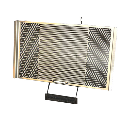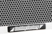 特長:フロントタイヤから巻き上げられた小石やゴミ、ライトめがけて飛んでくる昆虫...etc これらはアルミのフィンでできているラジエターコアへダメージを与えます。 フィンが潰されることによって冷却効果が失われ、場合によってはウォーターラインを破損しクーラント漏れを起こす危険も・・・ エッチングファクトリーのラジエターコアガードは、ラジエターに対して最も過酷とも言える真夏の8時間耐久ロードレースを中心に幾度となくテストを繰り返してきました。 メッシュパターンの配置、メッシュラインの太さ、そして開口率はレースからのフィードバックがぎっしりと詰まっています。 ・中央部分は細かく、両サイドは粗いヘキサゴンメッシュパターン。 これはフロントタイヤからスピンオフされた小石やゴミをタイヤ幅に合わせた中央部の細かいメッシュが 確実にガード。両サイドの粗いメッシュは冷却効率と保護性能という相反するテーマの両立を考慮 された開口率になっています。 ・材質の選択にも理由があります。 アルミやチタンの場合、板厚を下げる(強度を下げる)ことでしか実現できないメッシュライン幅を、ステンレス(SUS304 0.8t)を採用することにより理想のライン幅で強度を下げずに実現。 これらを踏まえたコアガードには、性能の維持するためのアイテムとしてだけではなく、さりげなく美しさをアピールするドレスアップ効果も兼ね備えました。