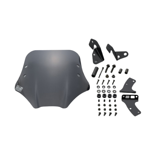 特長:スポーティーなエアロ形状フォルムのウインドシールドセット。スタイリッシュなデザインを演出するショートスモークタイプ。 正面から来た空気を上部へ送り、体への抵抗を軽減します。 ウインドシールドは、状況に合わせ約10度の範囲内で角度調整が可能です。 ウインドシールドの素材は、同厚のアクリルに対し約30倍の強度を持つポリカーボネート(厚さ3mm)を採用。また、耐傷性,耐UV性を向上させるためにハードコーティングを施し、高い透明度と耐久性を両立しました。 付属のクランプバーは、スマートフォンホルダーなどの取り付けの際にご利用ください。
