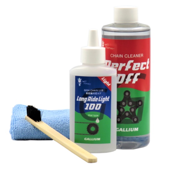 備考:※ガリウムのルブは従来の「油」ではなく「パラフィン・ワックス(蝋)」を主原料にしています。そのため、先に使用した「油」を原料とするルブが残っていると、ルブがチェーンのリンク(コマ)へ浸透せず、持続性に悪影響がありますので、「Perfect off(ディグリーザー)」を使って必ず古いルブ(油)を取り除いてからご使用ください。