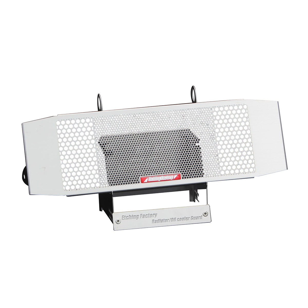 特長:「冷却効率と保護性能という相反するテーマをいかにして両立させるか。」 フロントタイヤから巻き上げられた小石やゴミ、ライトめがけて飛んでくる昆虫...etc これらはアルミのフィンでできているラジエターコアへダメージを与えます。 フィンが潰されることによって冷却効果が失われ、場合によってはウォーターラインを破損しクーラント漏れを起こす危険も・・・ エッチングファクトリーのラジエターコアガードは、ラジエターに対して最も過酷とも言える真夏の8時間耐久ロードレースを中心に幾度となくテストを繰り返してきました。 ・エッチングファクトリー製の特徴 メッシュパターンの配置、メッシュラインの太さ、そして開口率はレースシーンから のフィードバックがぎっしりと詰まっています。 中央部分は細かく、両サイドは粗いヘキサゴンメッシュパターン。 これはフロントタイヤからスピンオフされた小石やゴミをタイヤ幅に合わせた 中央部の細かいメッシュが 確実にガード。 両サイドの粗いメッシュは冷却効率と保護性能という相反するテーマの両立を考慮 された開口率になっています。 ・材質の選択にも理由があります。 アルミやチタンの場合、板厚を下げる(強度を下げる)ことでしか実現できない メッシュライン幅を、ステンレス(SUS304 0.8t)を採用することにより理想のライン 幅で強度を下げずに実現。 これらを踏まえたコアガードには、性能の維持するためのアイテムとしてだけではなく、 さりげなく美しさをアピールするドレスアップ効果も兼ね備えました。守る、魅せる。 あなたの大切なマシンの為に、自信を持っておすすめ致します。