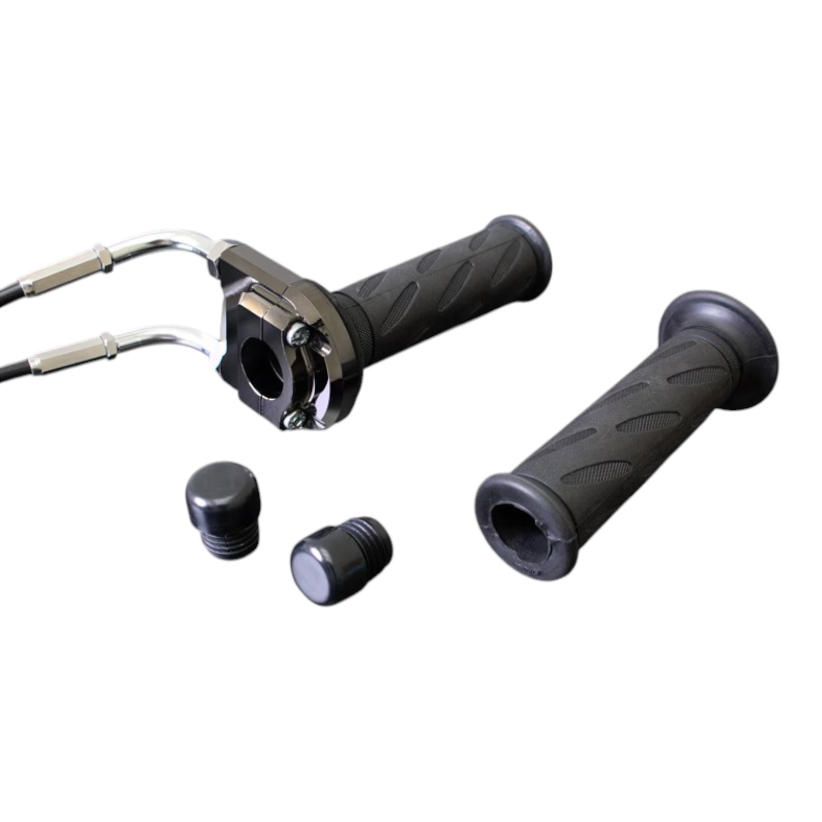 特長:ディマースイッチの操作性を考慮した、アルミ削り出しによるコンパクトなスロットルボディ。 高精度な切削加工がもたらす美しい造形は、ハンドルまわりのドレスアップにも最適です。