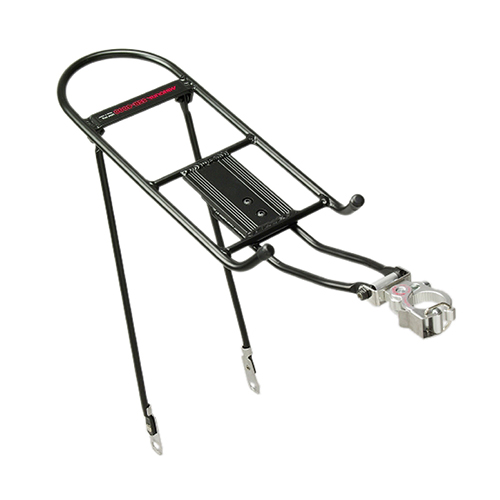 特長:必要なときにだけ装着することができるよう工具を用いることなく簡単に脱着できるリアキャリアです。 シートポストクランプはBH-100やSG-300などにも採用されている最新型のもので、側面のボルトを調整することで直径22〜29mmのシートポストに無段階に対応し、ワンタッチで脱着できます。 脚の先端はフレーム側に取り付ける特殊なつば付きナットに簡単に取り外しが可能です。 合計3ヶ所のピボット(可動軸)があり、スイングアームが上下してもそれぞれのピボットが動くことで、リアサスペンション装着車にも対応します。 SSR-3000に比べて縦横ともに大きくした天板をアルミパイプ製することで重量も100g軽く仕上がっています。
