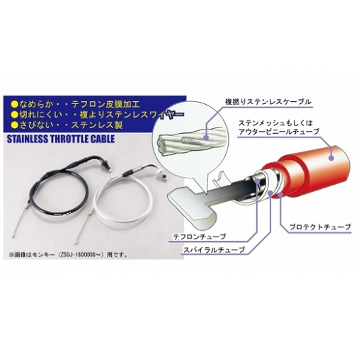特長:インナーケーブル高密度の複撚り(7×7=49本)に仕上げ、高張力加工、表面特殊加工を施した為、表面の凹凸が少なく、テフロンチューブ内蔵により、摩擦を減少させ、非常に滑らかなクラッチ、スロットルワークを実現しています。