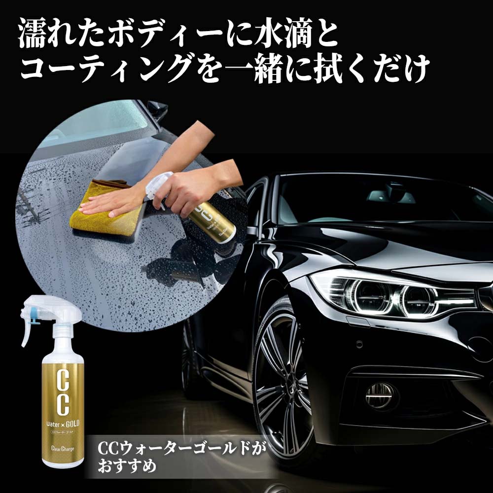 コーティング施工時にも便利で、濡れたボディーにCCウォーターゴールドをスプレーして水滴と一緒に拭くだけでスムーズに仕上がります。