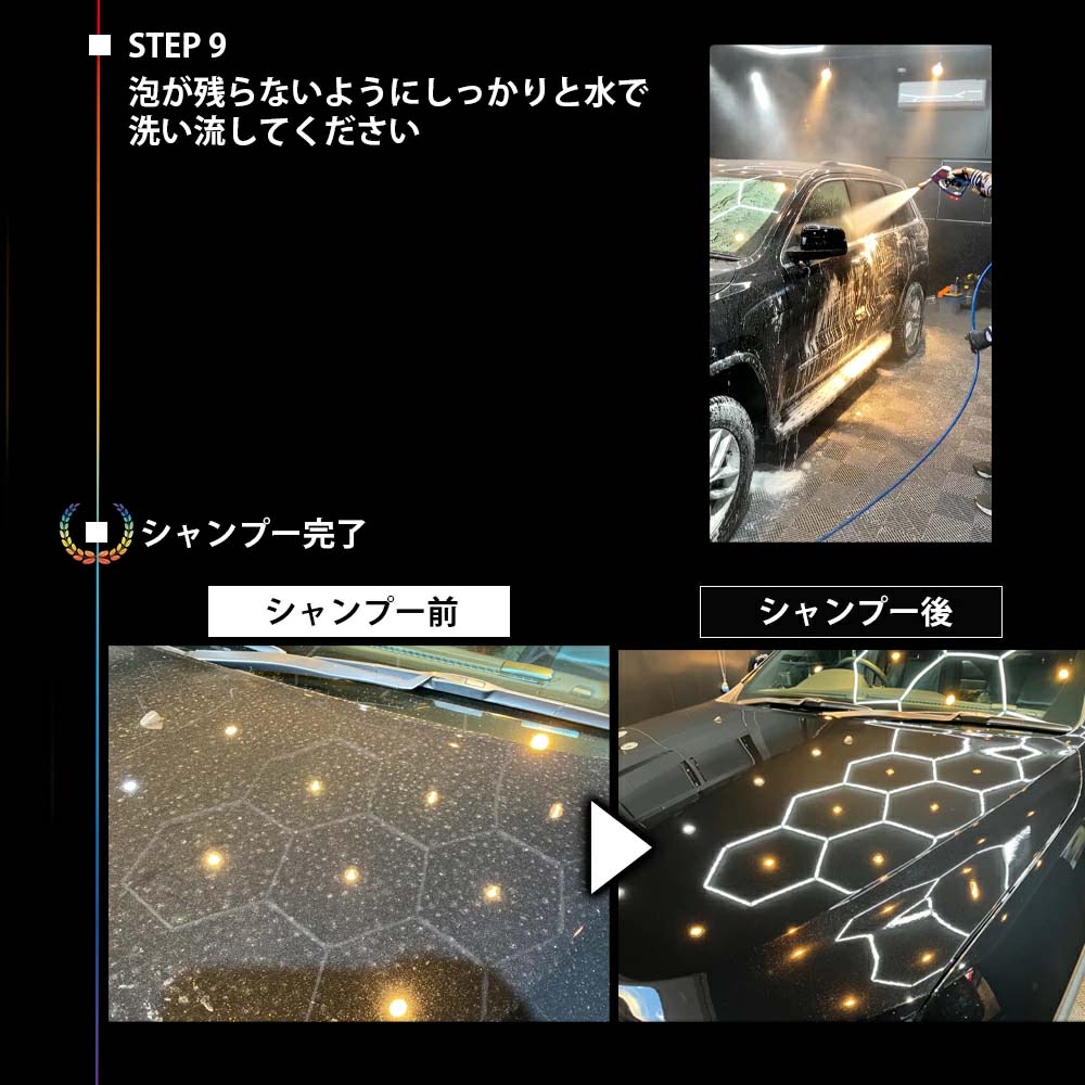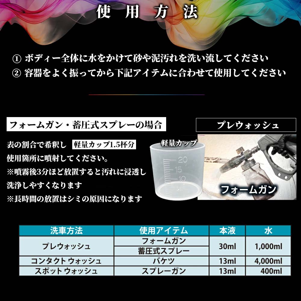 普段の洗車から仕上げ洗浄に最適で、アルカリ性・酸性シャンプー後の残留液もしっかりと落とします。