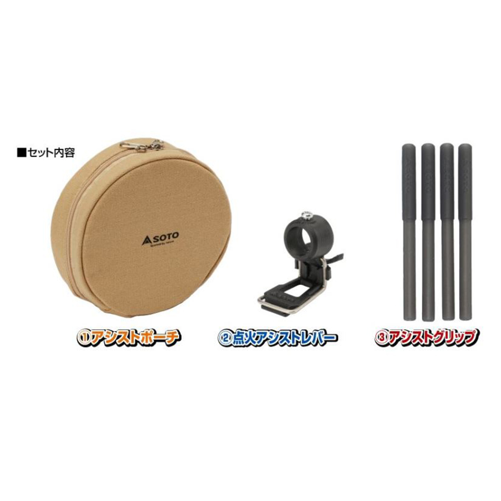 商品情報 | レギュレーターストーブを使いやすくアシストする3点セット。 (1)収納しやすい丸型の「アシストポーチ」。 (2)大きなレバーで点火をアシストする「点火アシストレバー」。 (3)ゴトクのスベリ防止と伝導熱をカバーする「アシストグリップ」。 の3点セットです。 |