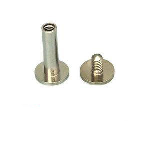 紙見本、アルバム冊子や、かんたんなビス止めにお使いいただけます。表には約9mmの丸い釦がでて、手で締めることができます。挟むものの厚みの総和が15mm〜16mmのものにお使いください。軸の太さが4mmのため、通す穴は直径4mm以上必要です。
