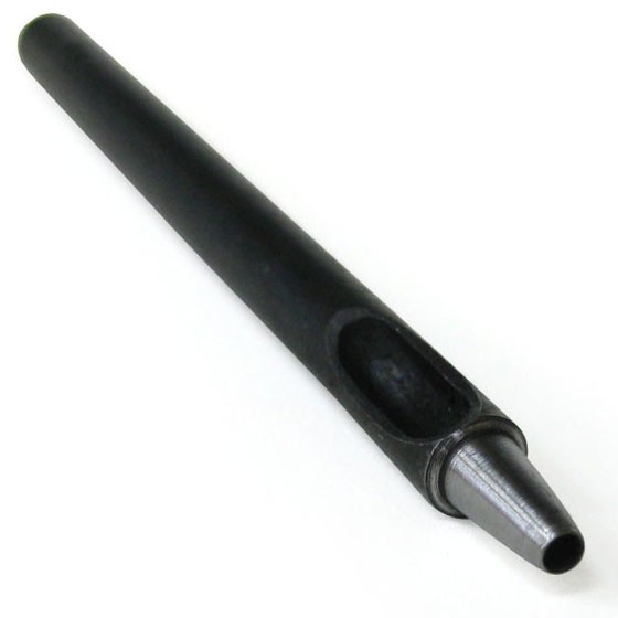 直径2mmの穴をあけるためのハガネでできたアナログライクな穴あけ工具です ハトメ抜きはその名の通りハトメ取り付けのために事前に穴あけするための道具ですが、カシメ取り付けにもお使いいただけます。