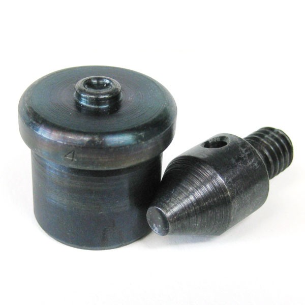 頭の直径3.5mmの両面ミニカシメ専用、ハンドプレスで打つための駒です。お持ちのハンドプレス機にとりつけて、両面のミニカシメを打つための治具パーツ。両面ミニカシメであればどういったものでも打ち込むことができ、足並・足長・足短といった足の長さを気にせずお使いいただけます。本体はSK鋼材を用いて製造しており、焼き加工が入っているためしっかりした強度があり、比較的長持ちします。日本の国内工場で製造しています。
