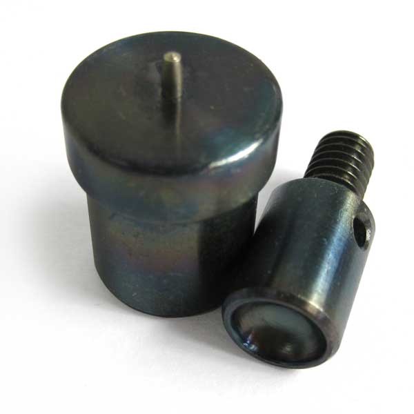 玉飾り(小玉カシメ)をハンドプレス機で打つための治具です。直径10mmのカシメ式の玉飾りをハンドプレス機で取り付ける場合に、この打駒と呼ばれるパーツが必要になります。上駒と下駒の2つのパーツで1セット。上駒は直径10mmの小玉カシメにピッタリ合わせて作られています。