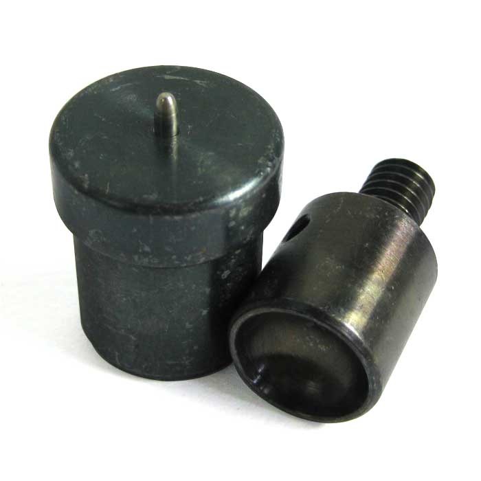 ハンドプレス機で、直径13mmの大きい玉飾り「大玉カシメ」のための治具パーツです。打駒は、取付けたい金具に合わせてつくられており、このパーツをハンドプレス機にとりつけることで、専用のカシメ機として機能します。カシメ式のスタッズを大量取付けする場合にお勧めです。