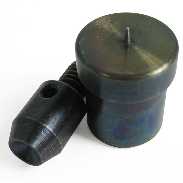 底辺の直径が約7mmの、円錐形の飾りカシメ「特小ピラミッド丸」のハンドプレス機用治具です。ハンドプレス機そのものだけではカシメは打つことができませんんが、この打駒をセットすることで専用のカシメ打機として機能します。