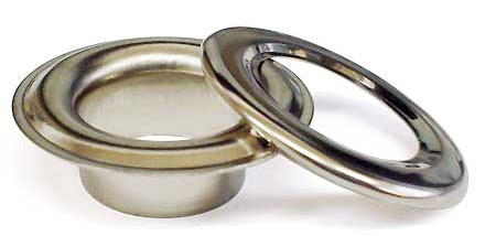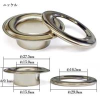 15mm径のハトメ「アイレット30」座金付きタイプです。専用の工具でとりつけることで裏面が丸く、リング状にして留めて仕上げることができますので、アイレットリングとも呼ばれます。高さ9mmですので、合計厚み7mmまでのものを目安にお取付けください。取付後には穴の縁に約3.5mm幅の均一な金属縁ができます。