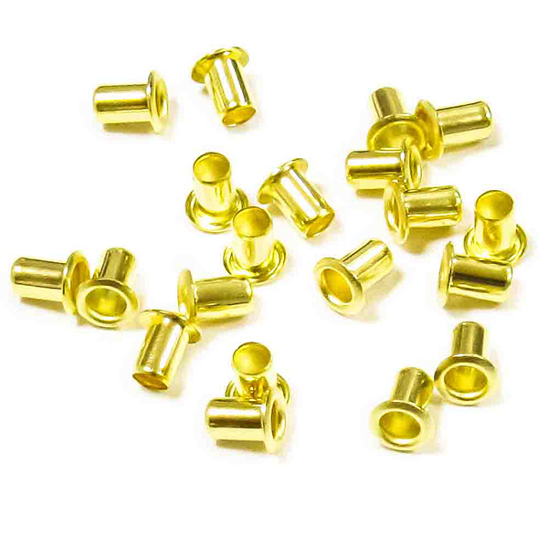 ハトメの筒の部分が直径2.5mmハトメ。金属の厚みがありますので、取付けた後の穴の内径は約2.1mmとなります。高さが4mm。真鍮製で座金は付属されません。ハトメ本体のみでお使いいただく電気ハトメです。厚み2mm以下の物にお使いいただけます。