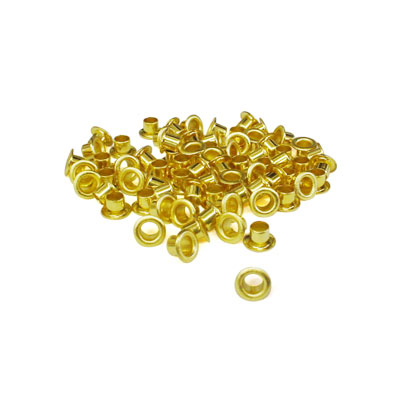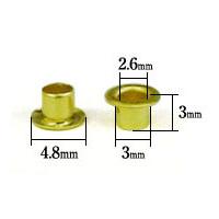 ハトメの筒の部分が直径3mmハトメ。金属の厚みがありますので、取付けた後の穴の内径は約2.6mmとなります。高さが3mm。真鍮製で座金は付属されません。ハトメ本体のみでお使いいただく電気ハトメです。対象の厚み1mm以下のものに使えます。