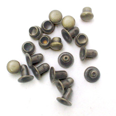 頭(メス)3.5mm、足(オス)4×4mmの極小サイズの「ミニカシメ」です。片面カシメで、軸径1.9mm。厚み4mm程度のものにお使いください。