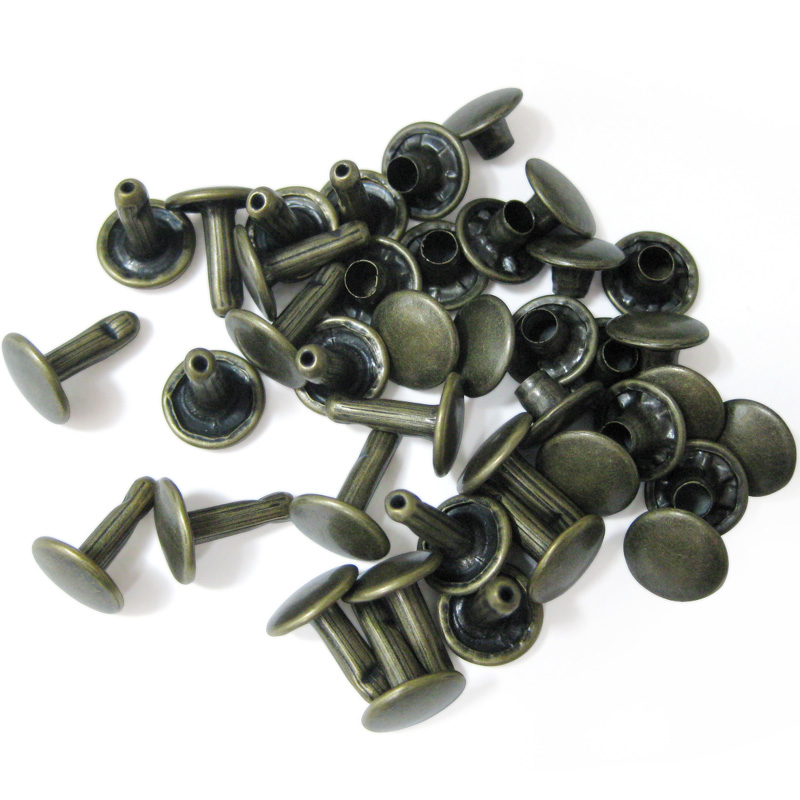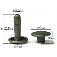 頭(メス)の直径9mm、足(オス)12.5mmの真鍮製の大カシメの足長の中タイプです。鉄製。両面タイプ。足軸径3mm。革や布の厚みが厚み9.5mm以下のものにお使いいただける特殊なカシメになります。