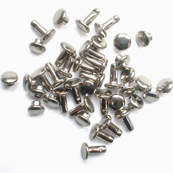 | 足の種類:両面足長 品 名:特小カシメ サイズ:頭4.6mm 幅4.6mm 高7mm 材 質:真鍮 メッキ:ニッケル・キリンス処理・アンティーク・黒ニッケル カシメは頭(メス)と足(オス)で一対、布や革を止める金具です。 布や革に、カシメの足を通る穴(多くは2mmないし3mm)をあけ、挟みこむようにして頭をかぶせ、足を潰してカシメをとめます。 リベットやハトメと違い、カシメは足がクルッとヒックリ返るわけではありません。 被せた頭の中で足がグシャッと潰れ止まっています。 「カシメがすぐ外れます」とのご質問いただくことがありますが、それはカシメている(足を潰している)のではなく、ただ挟んで頭を被せているだけの状態だからです。 足が潰れていない状態は「カシメている」になりません。 専用の工具(手打ち棒かハンドプレス)で上からしっかりと叩いてください。 |