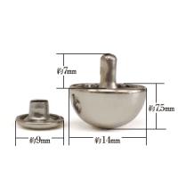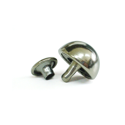 カシメとして鞄の底などに取り付けられる鋲金具です。足の長さ7mm、軸径3mm。このカシメを取付けるには、まず革(布)に3mm程度の穴をあけてカバンの底面外側から足(半丸の本体)を通し、カバン内側より頭(キャップのような小さい蓋)をかぶせ挟み込んでカシメてください。