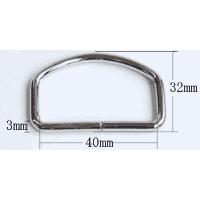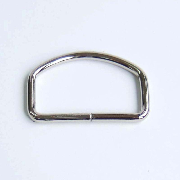 通し幅40mmの懐が四角いDカン金具が、本製品「40mm月カン」です。太さ3.5mmの鉄線に曲げ加工を施し、内径寸法40×24mmとなるDの形にしています。線の先端同士は溶接させていません。Dカンよりも通した紐などを左右にゆらさないものにお勧め。外径寸法は47×32mmという大きめのサイズです。鉄製の本体の表面にシルバー色のニッケル鍍金、グレー色の黒ニッケル鍍金、渋いブロンズ色のアンティーク鍍金をかけて仕上げました。