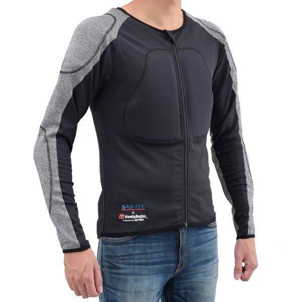 衝撃時に瞬間硬化するSAS-TEC製プロテクターを胸部・ひじ・肩・背中に装備。