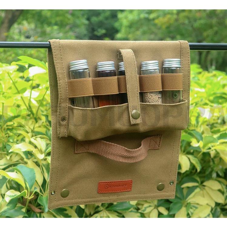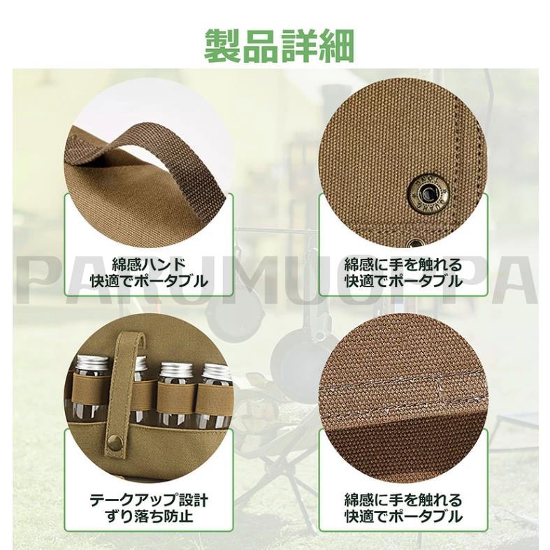 【調味料ケース製品仕様】収納バッグ本体:縦12cm?横23cm?奥行き7cm /広げて縦42.5cm?横23cm、重量:184g、材質:キャンバス生地、厚み:16Oz(オンス)。ボトル:10本セット、サイズ:10?3CM、重量:31g/1本、材質:PET。