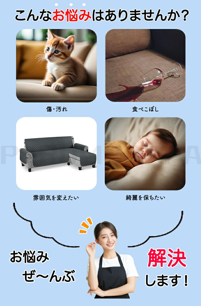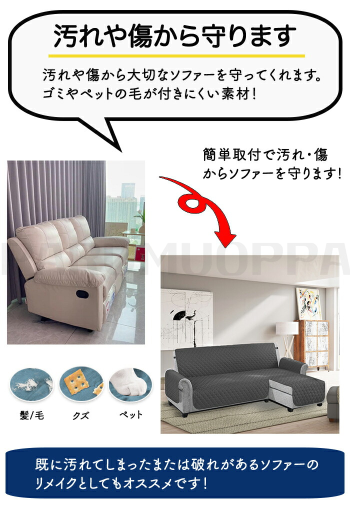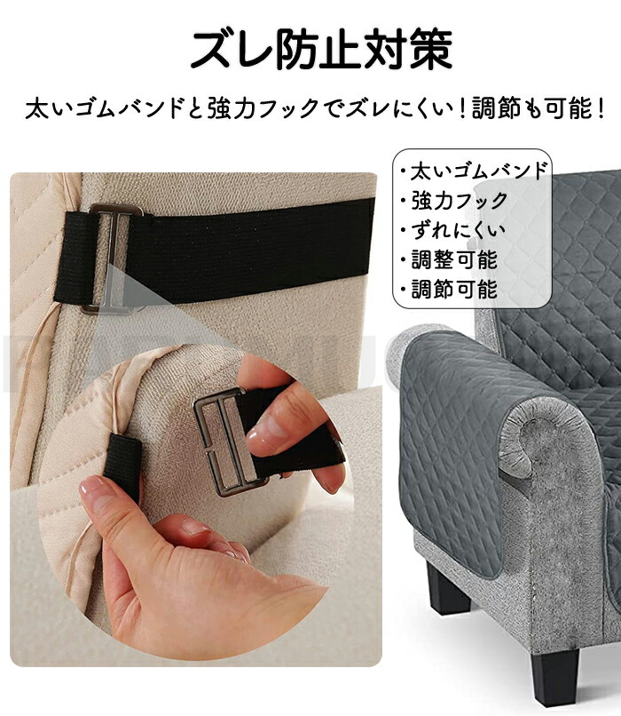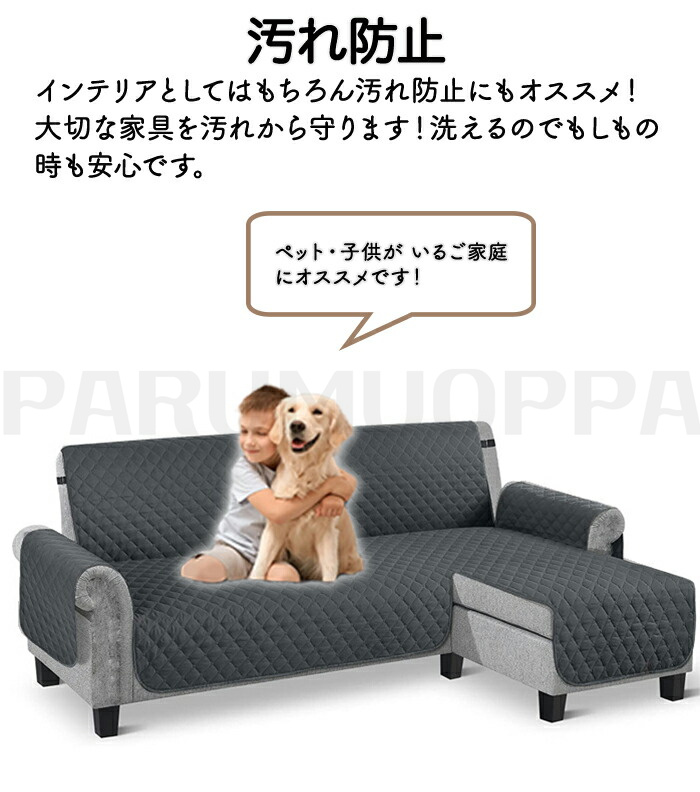 滑り止め機能が付いており、ペットが飛び乗ってもずれにくく、汚れや傷からソファーをしっかり保護します。