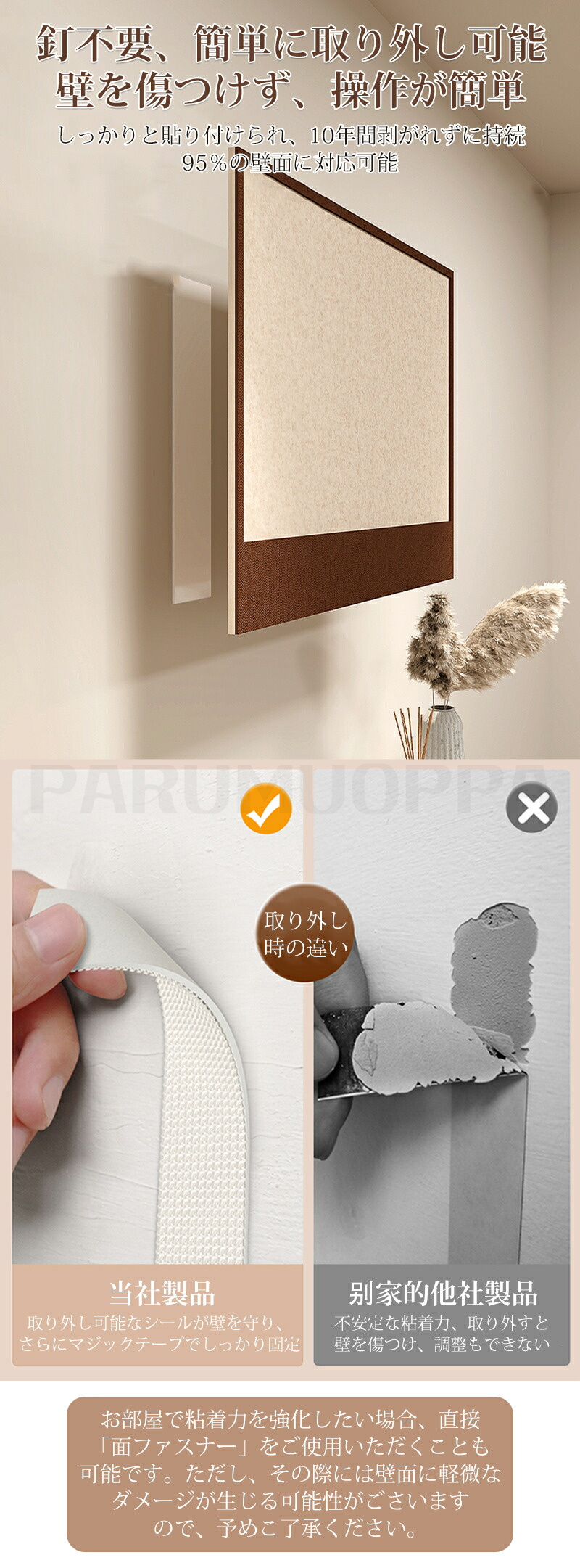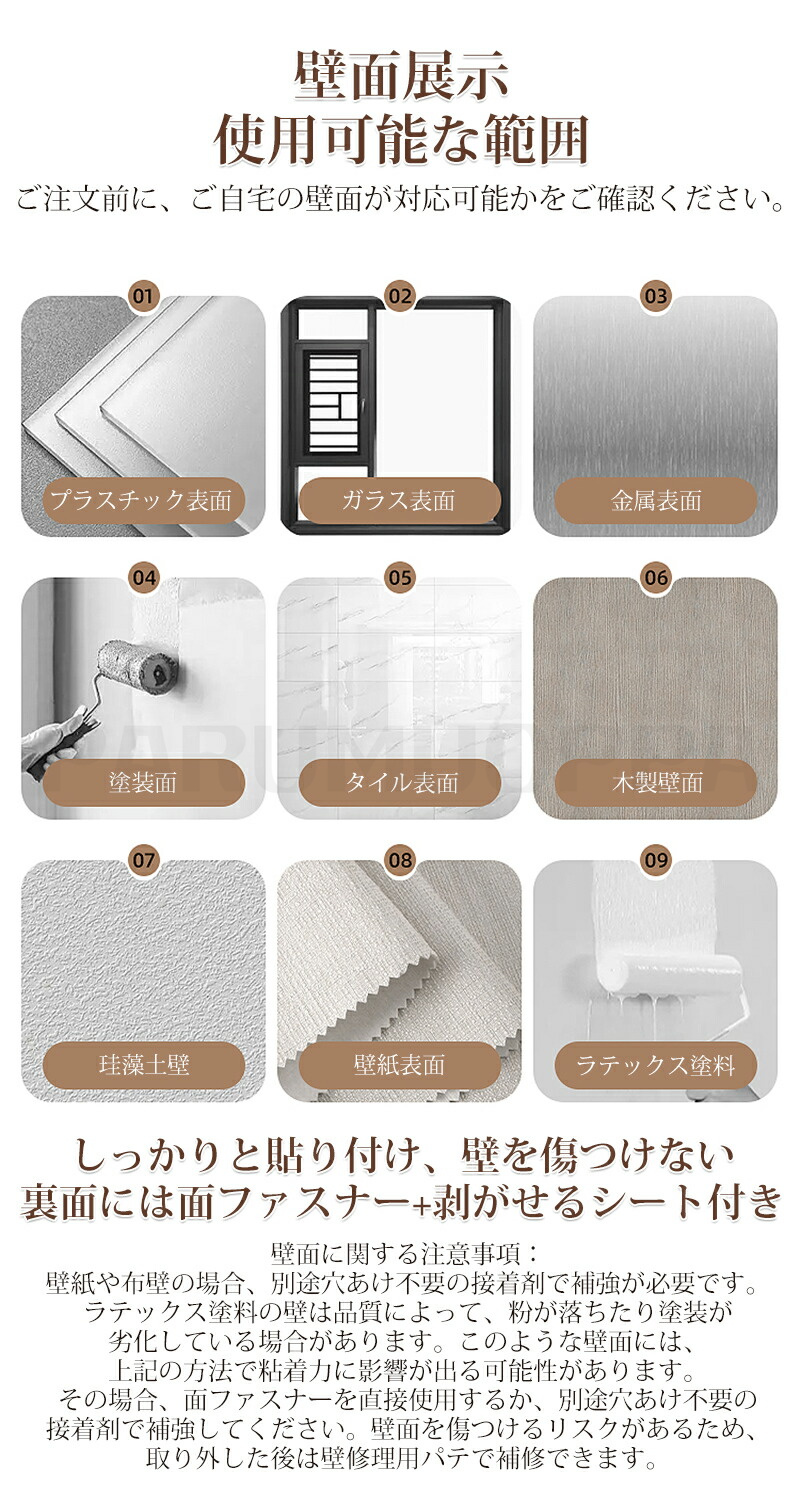 壁紙や布壁の場合、別途穴あけ不要の接着剤で補強が必要です。