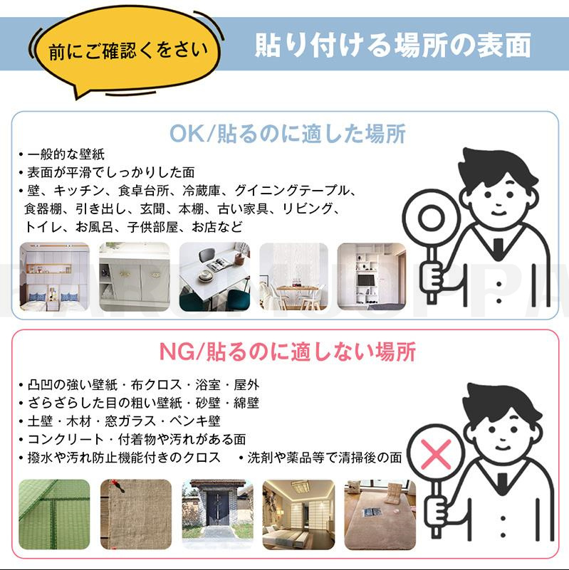 裏面にのり付きで、超簡単に2つのステップでDIYできます!剥がしてから貼るだけです。女性も子供も楽々と貼り付けができます。壁やお好きな小物の表面につるつるしたシールを貼り付けましょう!