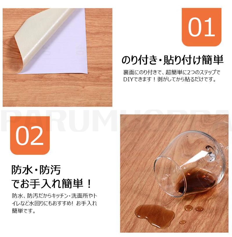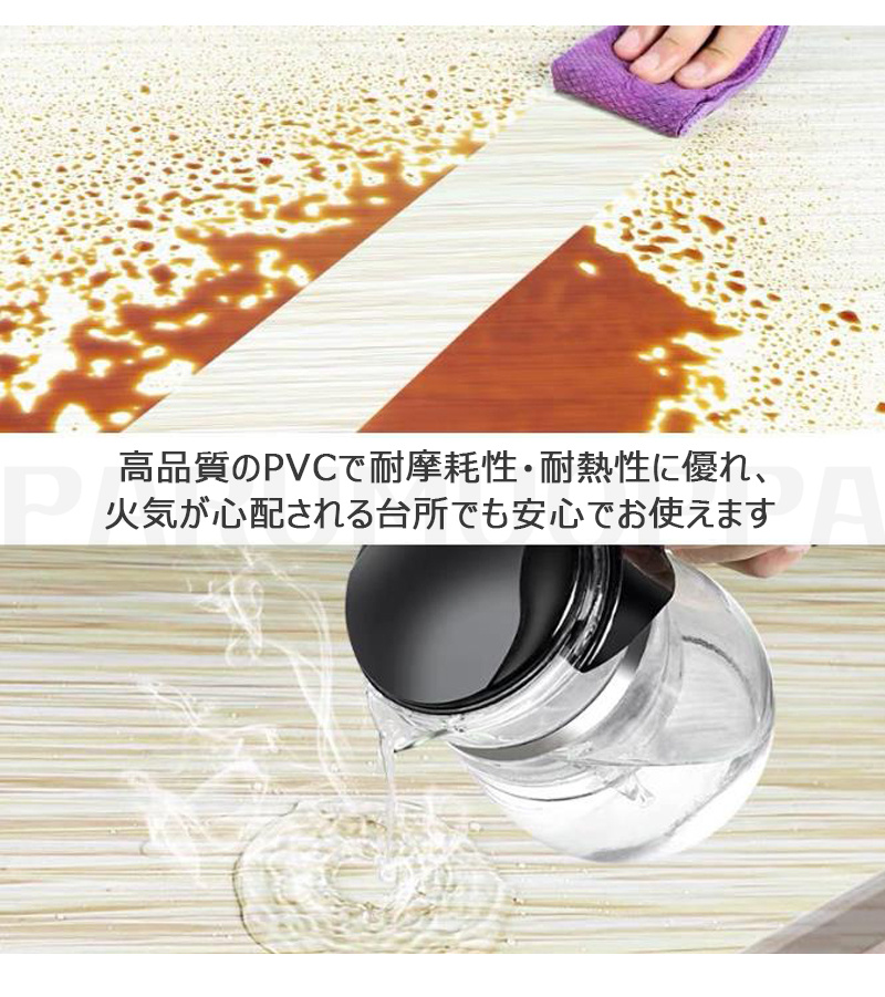 高品質のPVCで耐摩耗性・耐熱性に優れ、火気が心配される台所でも安心でお使えます。厚みのあるデザインので、壁紙に重ねて貼っても透けない。
