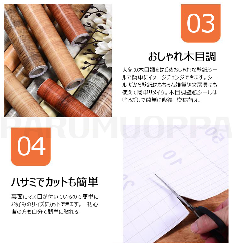 壁紙シートの裏面は方眼紙が付いているため、裁断しやすく、長さも分かりやすいタイプです。ご需要に応じて剥がしてから貼るだけでOK!不器用な初心者でも簡単にDIYできます。