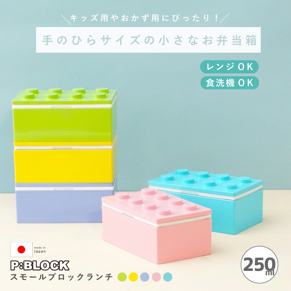 【P:BLOCK】スモールブロックランチ P:BLOCKは日常生活の中で使える楽しいブロックをコンセプトにしています。遊び心と誰でも楽しめるデザインを両立したランチボックスやカトラリーを中心としたブランドです。 品質には特にこだわり、ランチボックスは完全日本製です。 容量は少量サイズ 容量は250mlと少なめサイズです。小さいお子様のお弁当用や、デザートやフルーツ入れとしてもお使いいただけます。保冷剤付きです。 P:BLOCK用の専用設計 ブロックフォルムの細部までを最大限に再現するためには専用金型を開発することが必要不可欠でした。それは既存の金型を用いるという考え方では人の心がワクワクするアイテムを作ることはできないからです。 この商品のためだけに専用金型の設計及び作成そして商品生産を一貫して日本で行ったオリジナルのランチボックスです。 伝統的な技法を用いた塗りのお弁当箱 P:BLOCKブロック弁当箱は職人が日本に古くから伝わる塗りの技法に沿って手作業にて丁寧に重ね塗りをしています。重ね塗り をすることにより滑らかで鮮やかな色彩表現を可能にします。 職人と話し合いを続け、日常的に使うお弁当箱に伝統的な塗の技法を使用することに成功しました。 電子レンジ&食洗機対応 すべてを日本で生産し品質にもこだわりをもって作りました。電子レンジ及び食洗機対応にし、実用性をさらに高めました。 BPA不使用 BPAはビスフェノールAと呼ばれ、プラスティックの安定剤等です。欧米では使用が規制されているおり、多くに人が敏感になっています。 | ||
