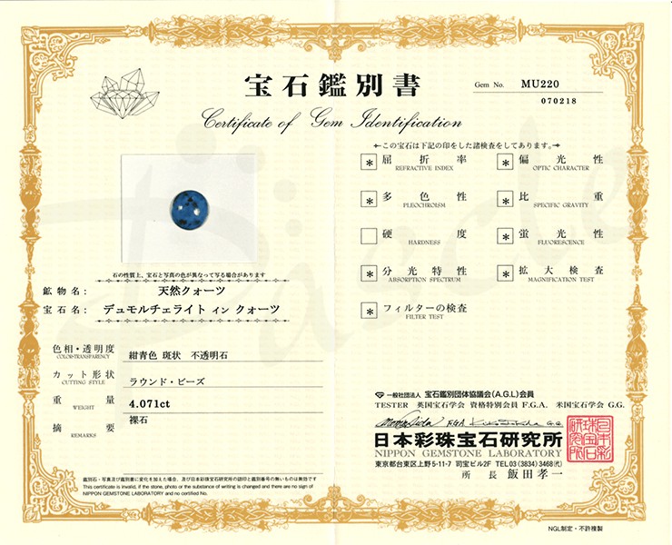 ※公開用の鑑別書について、仕入れ時の連(ブレスレット)の中から無作為でピックアップした粒(鑑別書写真の現品)が対象になります。使用する天然石はこの限りではありませんのでご注意ください。