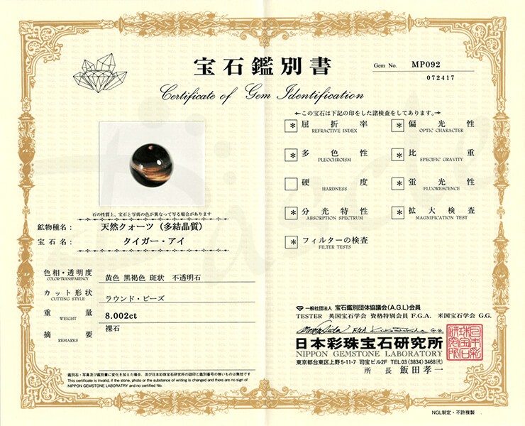 ※公開用の鑑別書について、仕入れ時の連(ブレスレット)の中から無作為でピックアップした粒(鑑別書写真の現品)が対象になります。使用する天然石はこの限りではありませんのでご注意ください。