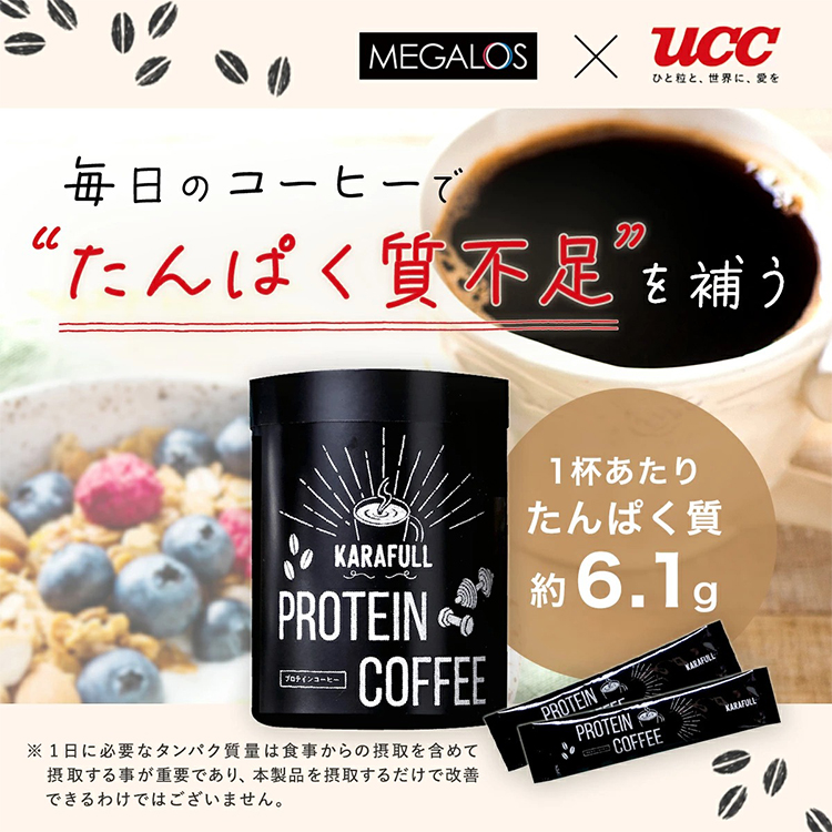 | 毎日飲むコーヒーを替えるだけ。メガロスとUCCが共同開発した、手軽にタンパク質が摂れるインスタントコーヒーです。健康と美容を意識するあなたの新しい習慣をサポートします。 |