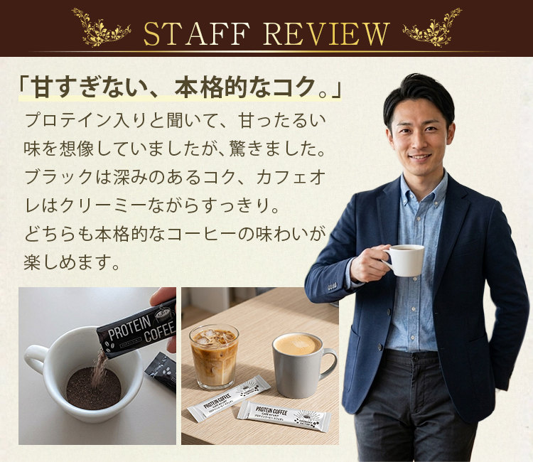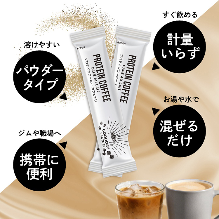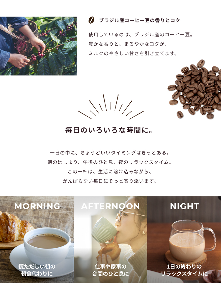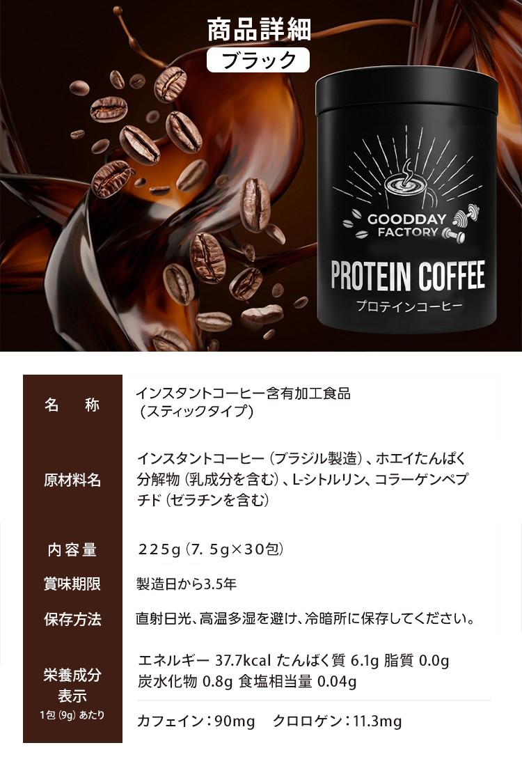 | 素材・成分 | ・インスタントコーヒー (ブラジル製造) ・ホエイたんぱく分解物(乳成分を含む) ・L-シトルリン、コラーゲンペプチド(ゼラチンを含む) |