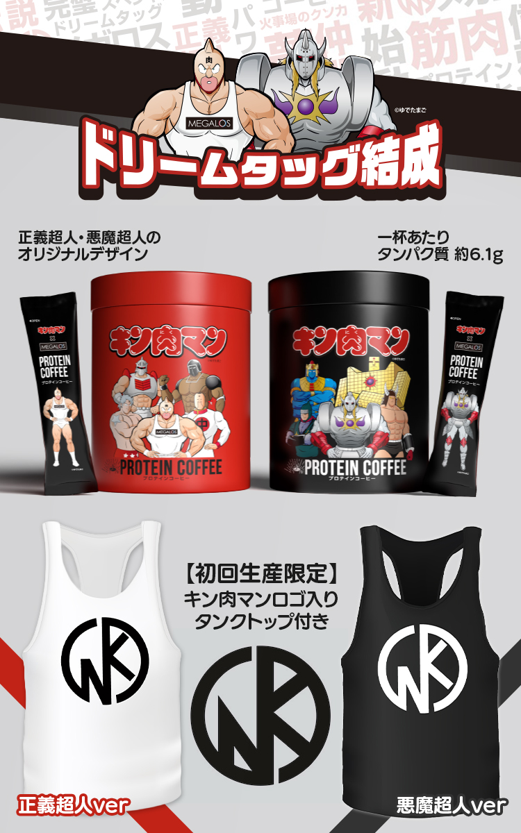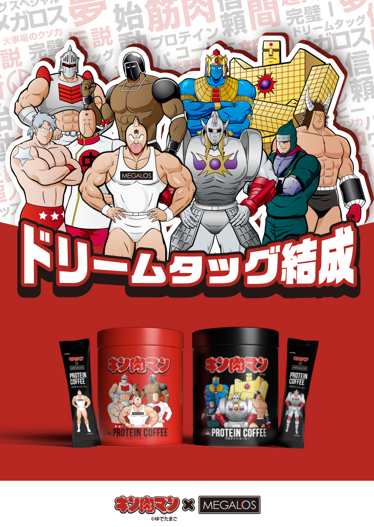 | フィットネスクラブ「メガロス」と、不朽の名作「キン肉マン」がタッグを組んだ特別仕様のプロテインコーヒーです。 正義超人や悪魔超人が描かれた大迫力のデザインは、ファンならずとも手に入れたくなる数量限定のタンクトップ付きBOX。 毎日のトレーニングやコーヒータイムが、超人たちの熱いエネルギーと共にさらに充実します。 【キン肉マン 正義超人特別パッケージ】 〜 友情の力と不屈の精神を感じるデザイン 〜 キン肉マンファン必見。 正義超人たちの世界観をモチーフにした、特別コラボパッケージが登場しました。 ・友情の象徴 キン肉マンをはじめ、数々の激闘を共にしてきた正義超人たちをイメージしたデザイン。 ・気持ちを高めるビジュアル トレーニングや日常のひとときを前向きな気分で過ごしたい方に寄り添います。キン肉マンならではの「友情」や「火事場のクソ力」の世界観を感じられる仕上がりです。 【キン肉マン 悪魔超人特別パッケージ】 〜 圧倒的な存在感と“悪の美学”を感じるデザイン 〜 キン肉マンシリーズの中でも、強烈な個性と美学で人気を集める悪魔超人たち。 その世界観を表現した特別パッケージが登場しました。 ・迫力あるキャラクターモチーフ ・ダークで力強いデザイン 正義超人とは対照的な、重厚感と迫力を感じさせるビジュアル。持つだけで印象に残る、存在感のある仕上がりになっています。 |