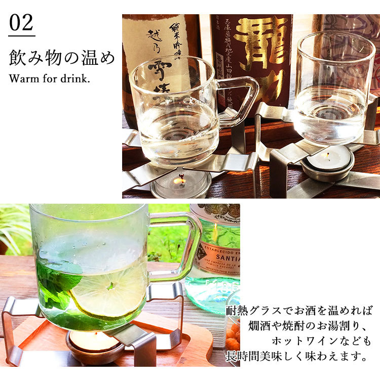 耐熱容器を使えば、コーヒーや日本茶、紅茶、熱燗やホットワイン、ホットウイスキー等のお酒など、