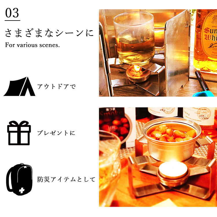 | 注意事項 | ※固形燃料は火が強すぎる場合がありますので、推奨しておりません。 ※足は折り畳み可能です。