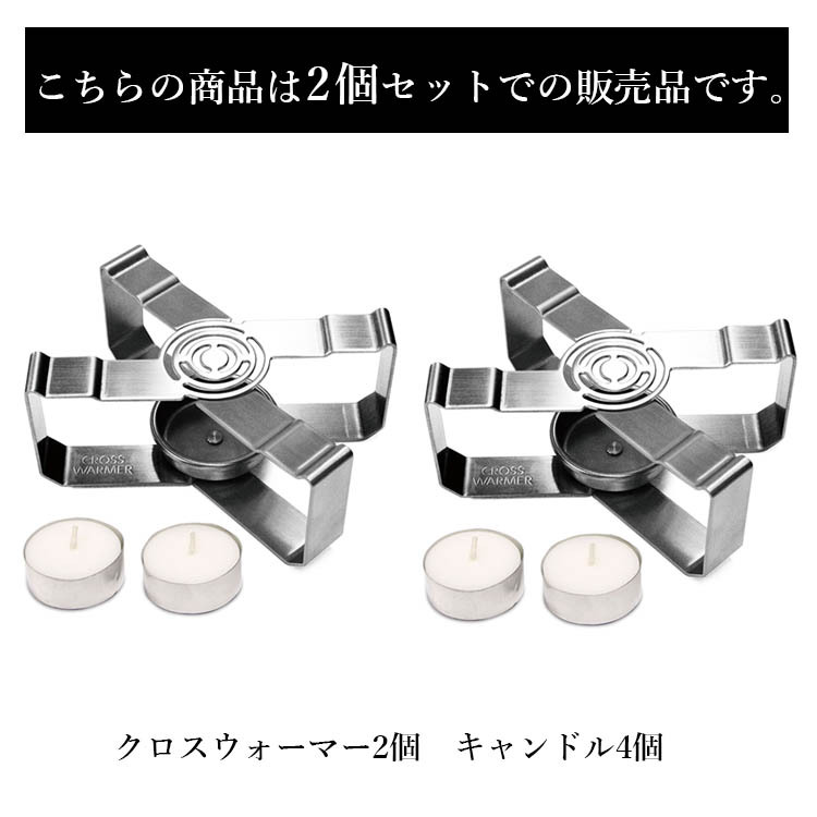 | 仕様 | 【セット内容】 クロスウォーマー1個×2 キャンドル2個×2 【使用燃料】 アルミカップ入りキャンドル(キャンドル径38mm 高さ18mm程度) 【使用方法】 お好みの缶づめを開蓋後この「CROSS WARMER」を使用して 温めた状態でお召し上がりが可能です。 |