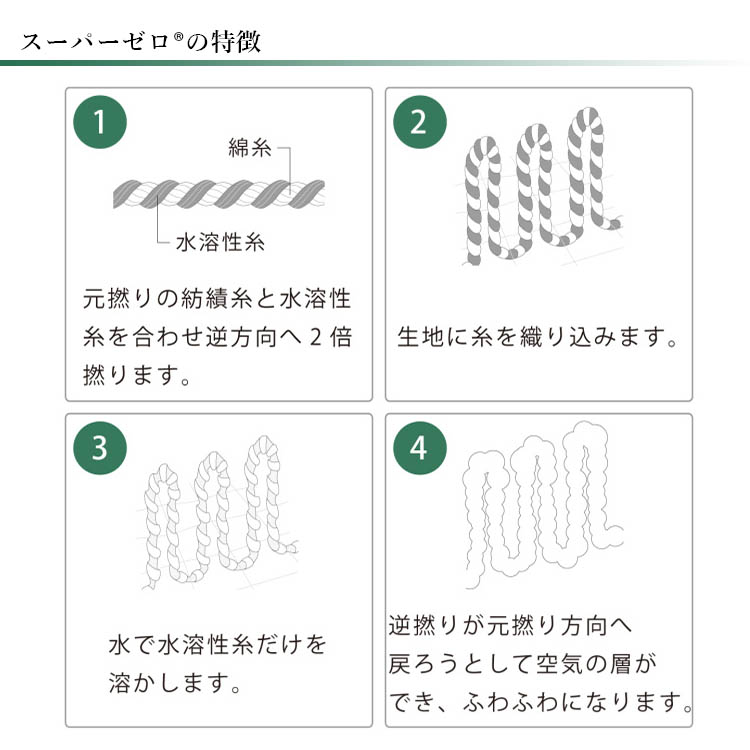 中層の一部に特殊撚糸工法で生まれた「スーパーゼロ®」を使用しています。この特殊糸を使うことでさらなるふわふわ感を実現しています。