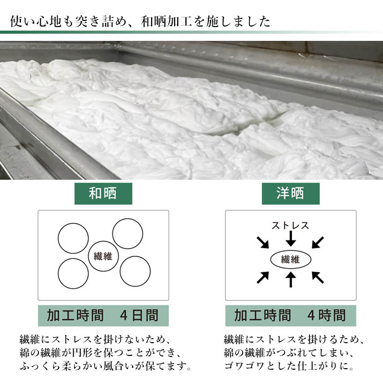 織り上げた生地の良さをさらに引き出すべく、和晒加工を施しております。この加工により、吸水性がよくなり、汗を多くかく時期でも快適に過ごせるガーゼケットになります。
