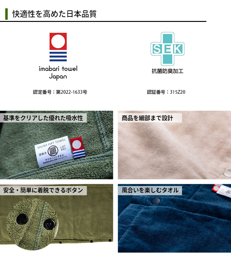 | 備考 | 検針済 SEK「抗菌防臭加工認証済」認証番号 315Z20 今治タオルブランド認定商品(今治タオル認定番号 第 2022-1633 号) |