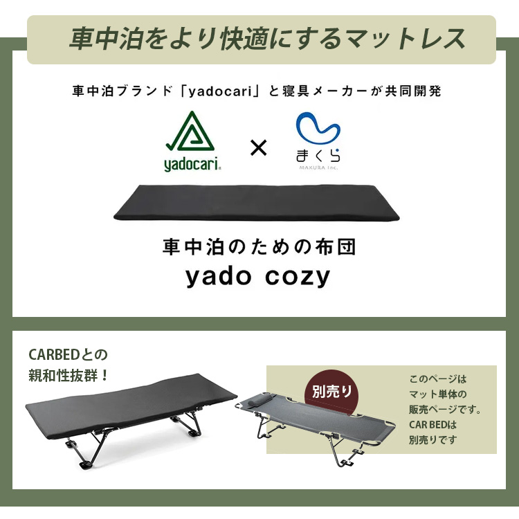| 車中泊アイテムブランド「yadocari」と寝具の専門会社がタッグを組み、CARBEDでより寝心地が良くなる布団が出来上がりました。 ※CARBEDは別売りです。こちらは布団(yado cozy)のみの販売ページです |