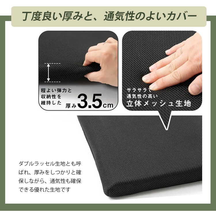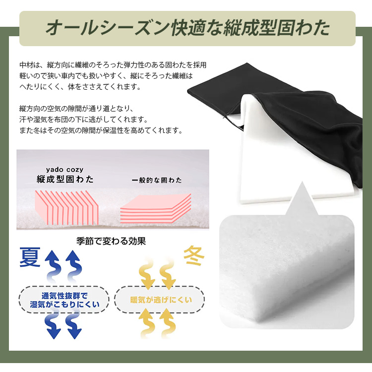 | 中材は、縦方向に繊維のそろった弾力性のある固わたを採用 軽いので狭い車内でも扱いやすく、縦にそろった繊維はヘたりにくく、体をささえてくれます。 【季節で変わる効果】 縦方向の空気の隙間が通り道となり、汗や湿気を布団の下に逃がしてくれます。 また冬はその空気の隙間が保温性を高めてくれます。 |
