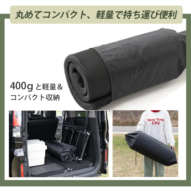| 車内の限られたスペースを上手に活用できるよう、丸めてコンパクトに、ラゲッジスペースでも場所を取りません 総重量も400gと持ち運びやすい重さ! |
